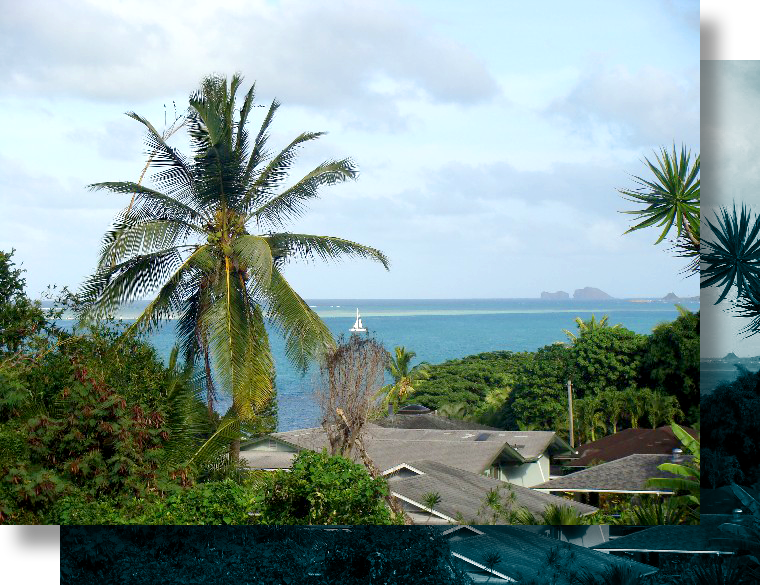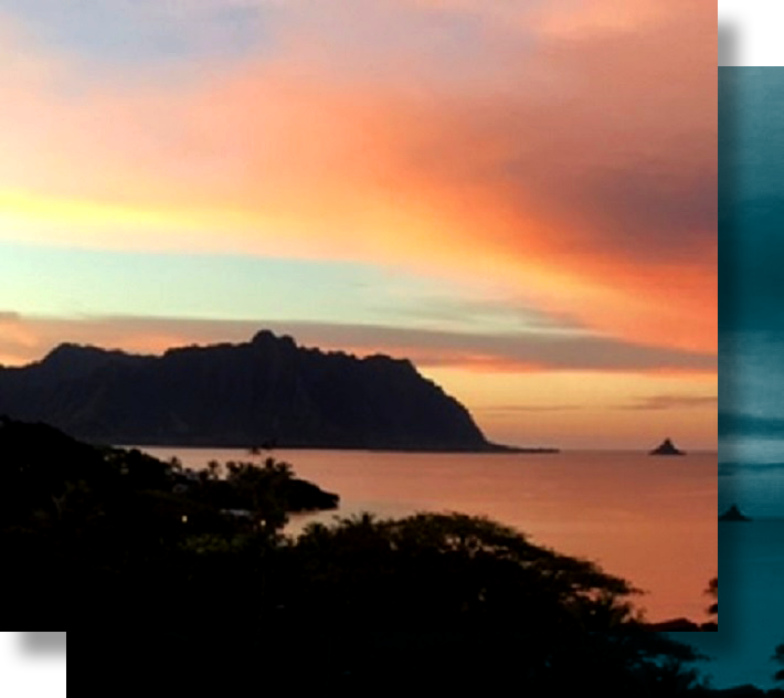 Our rooms share a breathtaking view of Kaneohe Bay [we are situated in the background of the left picture looking toward Chinaman’s Hat (the island in the foreground)].  To see the view of Kaneohe Bay from our property, please go to Our Accommodations to learn more.